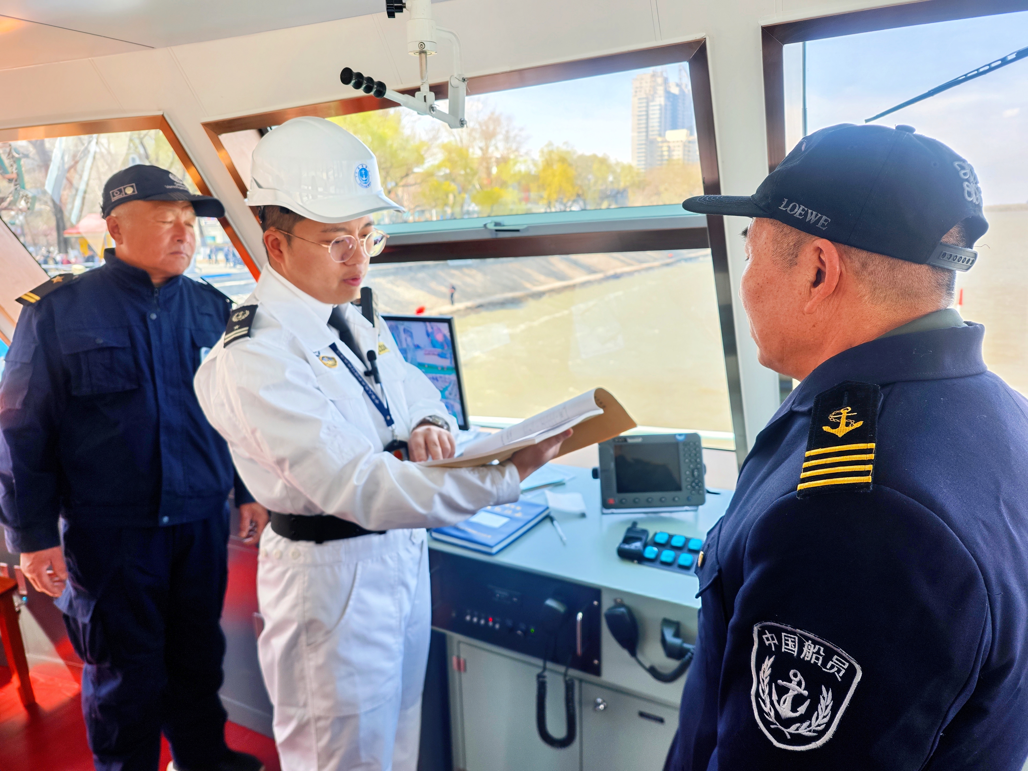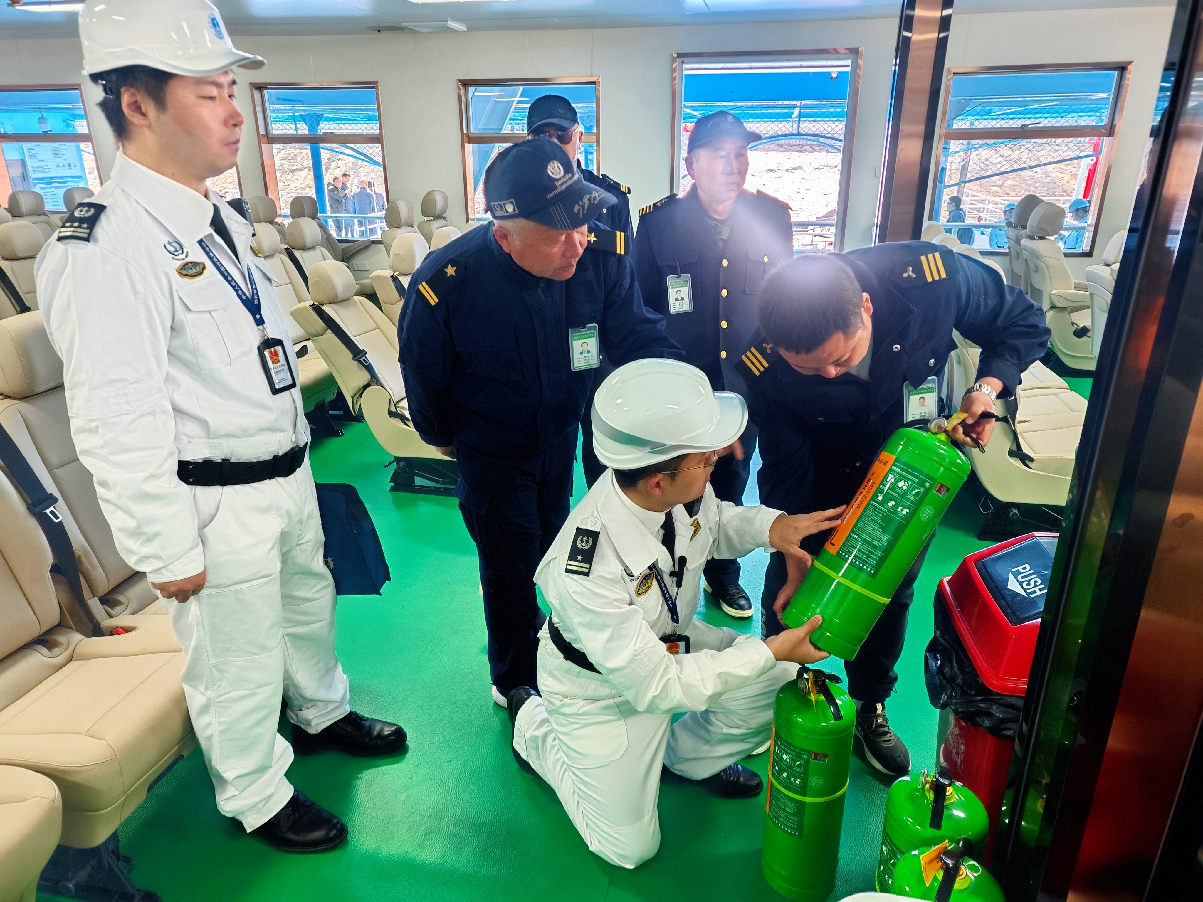 海事工作人員檢查客船上消防設(shè)備